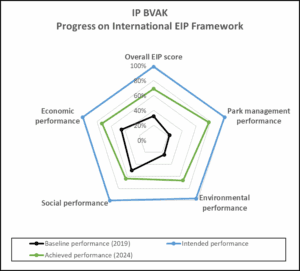 The park achieved the greatest performance in the management and environment categories due to the implementation of several EIP measures, such as: Monitoring performance and risks; Climate risk assessment; Environmental and Energy Management Systems; Heat recovery strategy. Social indicators were mostly unchanged probably due to full-scale invasion, while Economic increased with adoption of a strategy for attraction go SMEs.