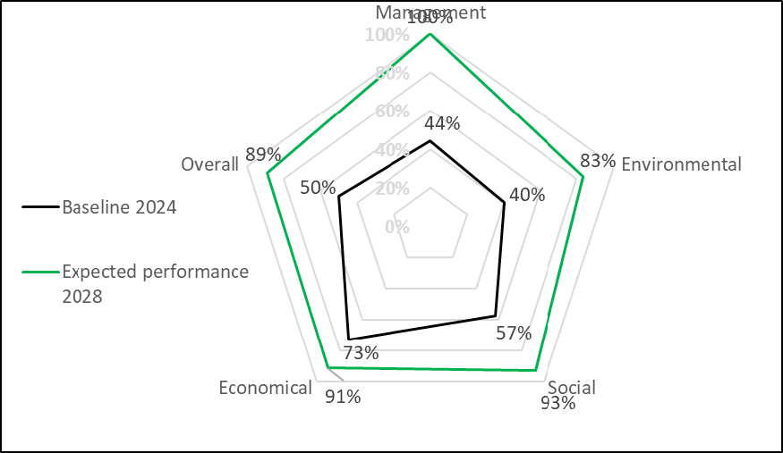 The black lines show the park’s achieved scores in 2024 for each Eco-Industrial Park aspect (Economic, Environmental, Social, and Park Management), while the green lines indicate the expected scores by 2028.