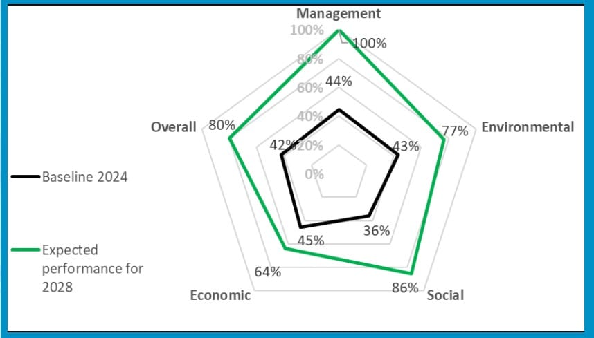 The black lines show the park’s achieved scores in 2024 for each Eco-Industrial Park aspect (Economic, Environmental, Social, and Park Management), while the green lines indicate the expected scores by 2028.